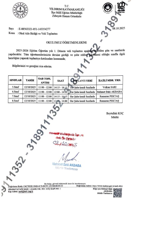 12.00-14.00 saatleri arasında 6. ve 8. sınıf veli toplantıları ( her sınıfın kendi dersliğinde ),